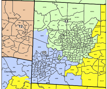 The southwestern portion of Guilford County including most of High Point is in the 10th District with Davie, Rowan and Cabarrus counties and portions of Davidson and Iredell counties.